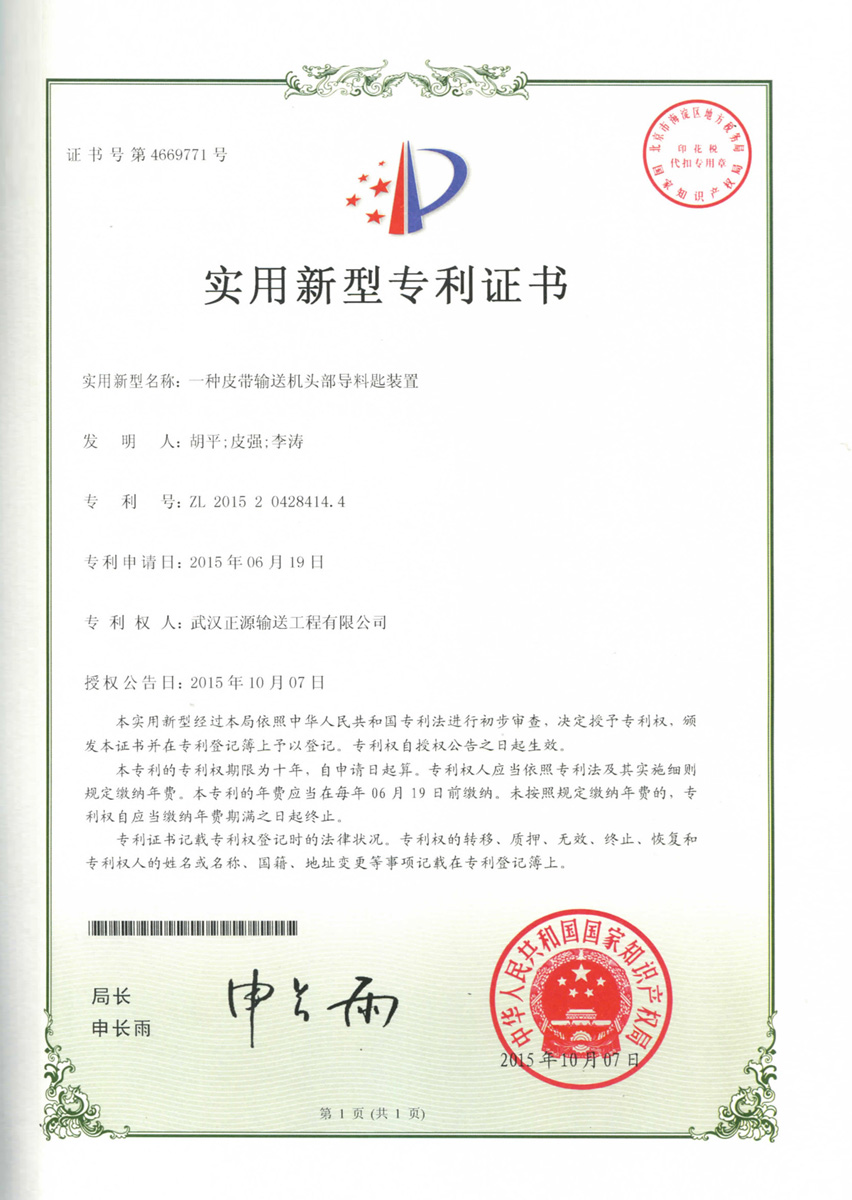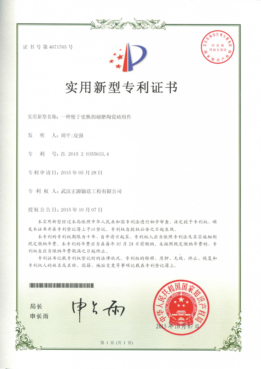 - 近日,武汉正源的“一种便于更换的耐磨陶瓷砖组件”和“一种皮带输送机头部导料匙装置”获得国家知识产权局颁发的专利证书。