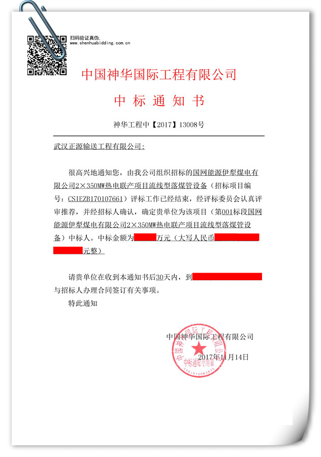武汉正源中标国网能源伊犁煤电有限公司流线型落煤管设备