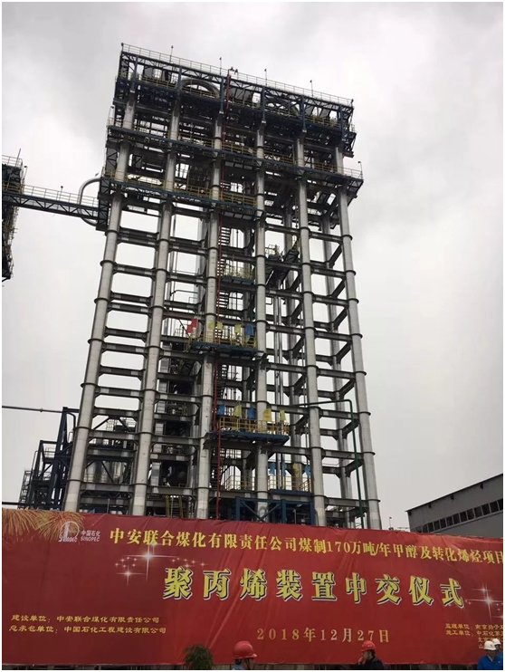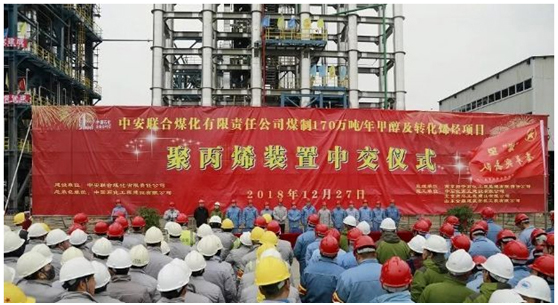 继中安联合煤化工项目净化装置顺利建成,实现高标准中交后,2018年12月27日上午,中安联合煤化有限责任公司煤制170万吨/年甲醇及转化烯烃项目聚丙烯装置举行中交仪式!