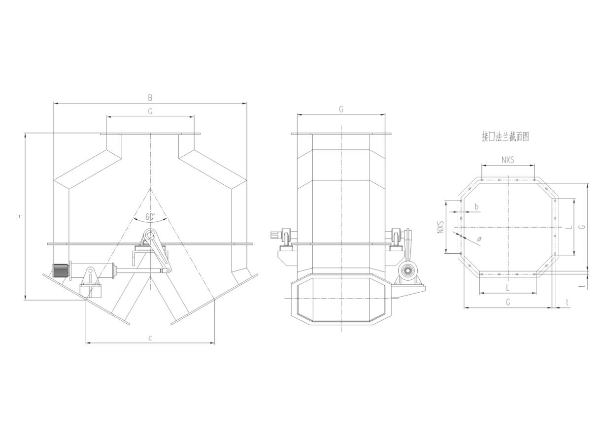 防卡堵电(液)动三通可实现物料流向的快速切换,在传统挡板三通及船型三通的基础上进行优化设计。该三通不仅避免了传统挡板三通卡滞现象,同时也克服了船型三通上部受料时,挡板抖动造成信号丢失的问题,是一种新型的、先进的物料切换装置。