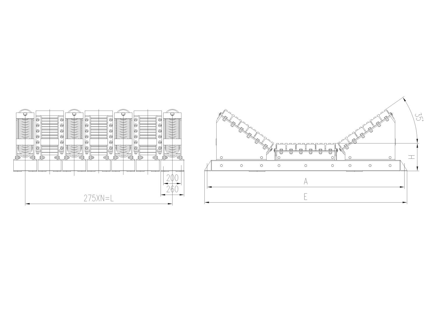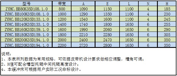 ●缓冲条与缓冲托辊组合布置,缓冲床与皮带的摩擦系数极低,适合高带速(3.5m/S以上)皮带的缓冲;